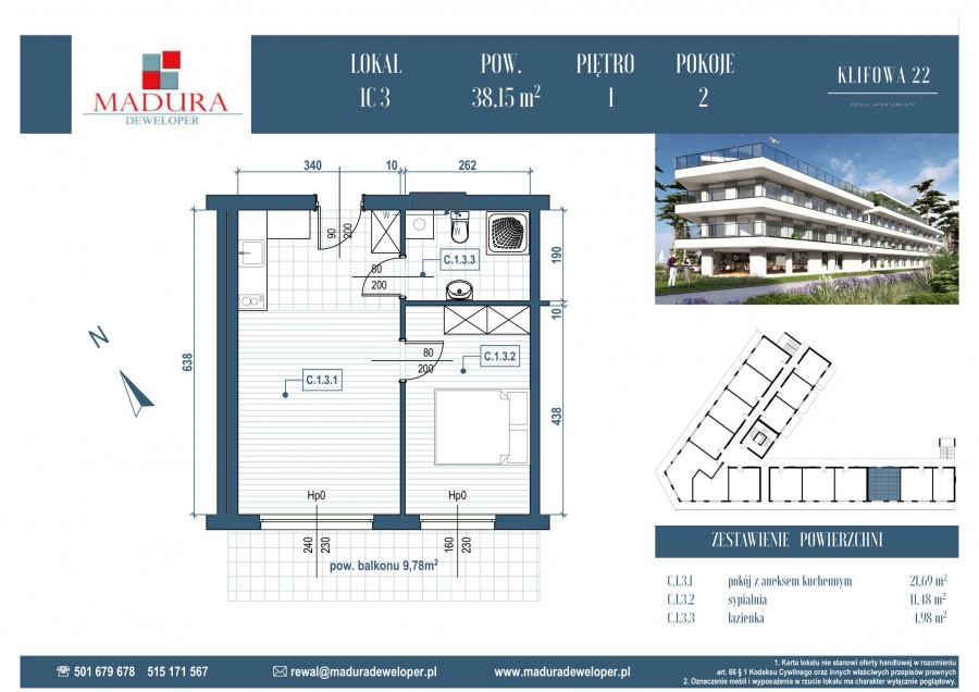 OpisZapraszamy do biura sprzedaży w każdą sobotę na terenie inwestycji w Rewalu ul. Klifowa 22 w godzinach od 12 do 17 oraz do umawiania spotkań telefonicznie - jesteśmy do Państwa dyspozycji przez 7 dni w tygodniu. Oferta dotyczy apartamentu wykończonego pod klucz* Na sprzedaż wykończony apartament 2 pokojowy. Rewal, ul.Klifowa 22 - lokal C.1.3. - pierwsza linia brzegowa - pow. 38,15m2 - I piętro - 2 pokoje - taras o pow. 9,78m2 Wynagrodzenie Pośrednika pokrywa Sprzedający ! Zakup apartamentu to dobra inwestycja oraz lokata kapitału z możliwością zarabiania przez cały rok. Apartament sprzedawany w standardzie wykończonym ściany wygładzone, pomalowane na biało, maty grzewcze elektryczne w całym apartamencie, panele, drzwi w kolorze białym do sypialni i łazienki, łazienka w pełni wykończona (kafle, umywalka, szafka pod umywalkę, lustro, wc, kabina prysznicowa, piec do ogrzewania ciepłej wody elektryczny). Bez mebli kuchennych oraz pokojowych. Inwestycja zakończona ! Podana cena apartamentu jest ceną netto, należy doliczyć podatek VAT 23%. Istnieje możliwość zakupu miejsca postojowego naziemnego. Lokalizacja inwestycji jest doskonała dla miłośników morza i plażowych atrakcji. Rewal jest popularnym miejscem wypoczynku zarówno dla turystów krajowych, jak i zagranicznych. Zaledwie kilka kroków dzieli apartamenty od pięknej plaży, gdzie można cieszyć się relaksującymi spacerami, kąpielami w morzu czy opalaniem się na słońcu. W okolicy znajdują się również restauracje, kawiarnie i sklepy. Zapraszamy do kontaktu oraz do biur sprzedaży w Szczecinie oraz na terenie inwestycji w Rewalu. Treść niniejszego ogłoszenia nie stanowi oferty handlowej w rozumieniu Kodeksu Cywilnego. Treść ma charakter informacyjny i zalecamy ich osobistą weryfikację. Kontaktując się z biurem Klient wyraża zgodę na przetwarzanie danych. FOCUS NIERUCHOMOŚCI KATARZYNA CHOROMAŃSKA OROWICZ Cztery Pory Roku 12 5 71-806 Szczecin tel.: 881640777 email: biuro@focus.nieruchomosci.pl |